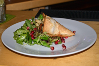 Als Ameuse Geulle reichte man uns eine Curry-Ananas-Suppe mit getrockneter Pflaume, dem folgten wunderbare exotische Calamari in der knusprigen Tortilla-Schale an einem Salat mit Granatapfelkernen.