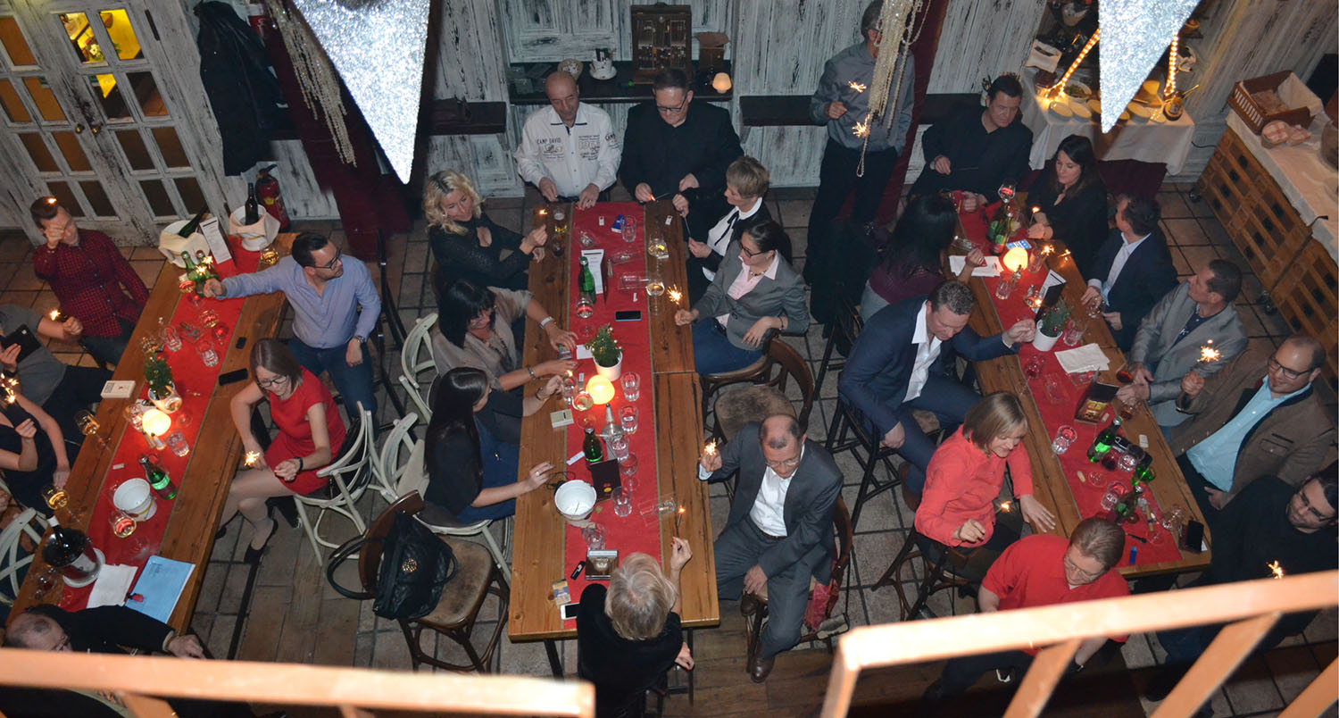 Wir taten heuer gut daran, den Veranstaltungsort im Josef zu wechseln. 38 Anmeldungen und dann noch 5 unerwartete nicht angekündigte Ausfälle wären viel zu wenige Teilnehmer für die große Räumlichkeit im „Kaufmanns“ gewesen. So aber füllten wir perfekt das Sudhaus und viele der Teilnehmer erwähnten, dass dieser Ort zwar nicht so schön und anmutig ist, sich aber für eine gesellige Weihnachtfeier noch besser eignete.