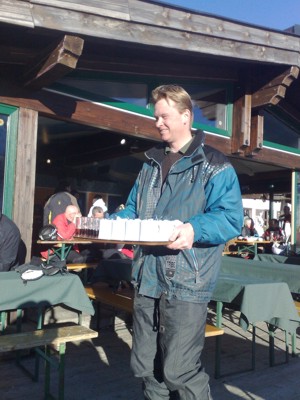 Und auch unser Hotelier genoss den vorletzten Tag der Saison in vollen Zügen. Dass Erwin das Abendessen im Schioutfit servierte, lag wohl nicht nur allein an der Trinkfestigkeit unserer Klubmitglieder.
