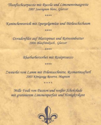 Neben den passenden Weinen, Welschriesling 2003 Taferner, Sauvignon Blanc 2003 Pfaffl, Heinrich Red aus der Magnumflasche und 2001 Excalibur von Taferner, wurde zum Kaffe noch eine Williamsbrand von Ferdinand Parzmaier gereicht.